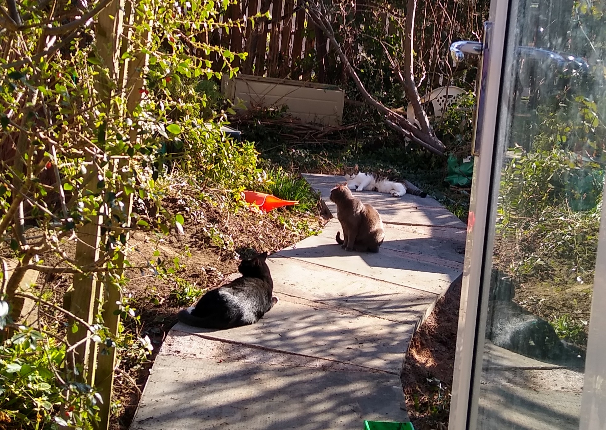 The family cats like to keep me active during my audiobook/craft/gardening time by taking it in turns to sit at the door waiting to go out and then sitting just outside the door waiting to come in about three minutes later. The smallest one likes to scrabble on the glass to make sure I’m paying attention. I’ve recently had a new garden path made which they seem to approve of.