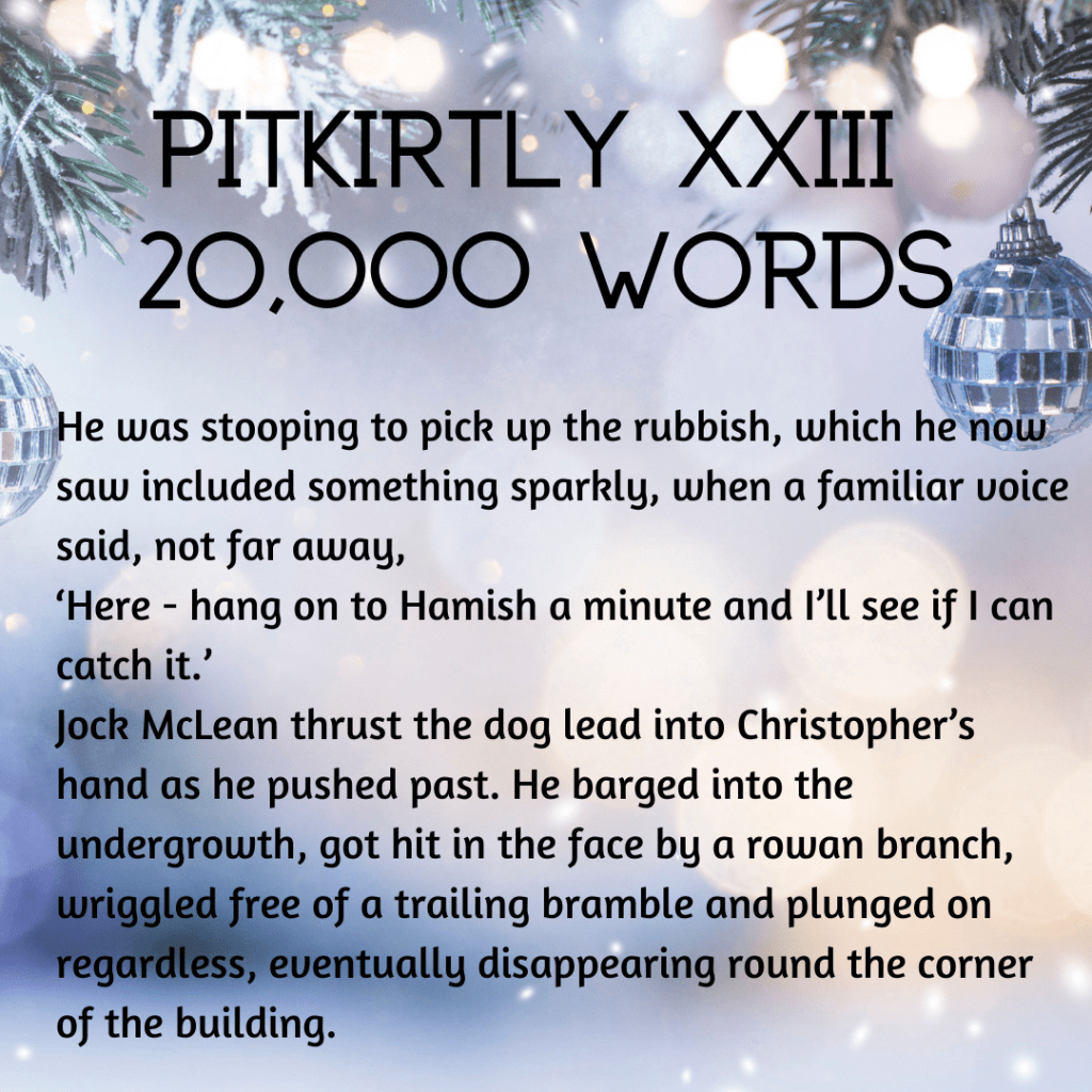 I am happy to report that I’ve just got past 20,000 words in Pitkirtly XXIII (‘The Christmas Catastrophe’) and the story is progressing more or less according to the very vague plan in my head. This is in spite of a recent blip when I realised I had written a pivotal chapter in a way that didn’t work – I can’t really explain why I knew this without giving too much away but it was a kind of logistical / timing issue. I am glad to have realised this in time to rewrite the chapter instead of getting myself tied in knots as the plot went on.