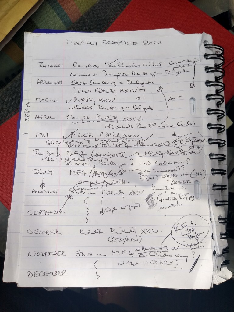 Whatever happens next, I find it’s a good idea to review the options at intervals and to update my annual plan. I fondly remember writing this at the start of the year and smiling smugly to myself about how beautifully neat it looked. 2022 would obviously be the year when I would abandon all my chaotic ways and start to approach writing – and life, for that matter – methodically. How did this work out? See for yourself.