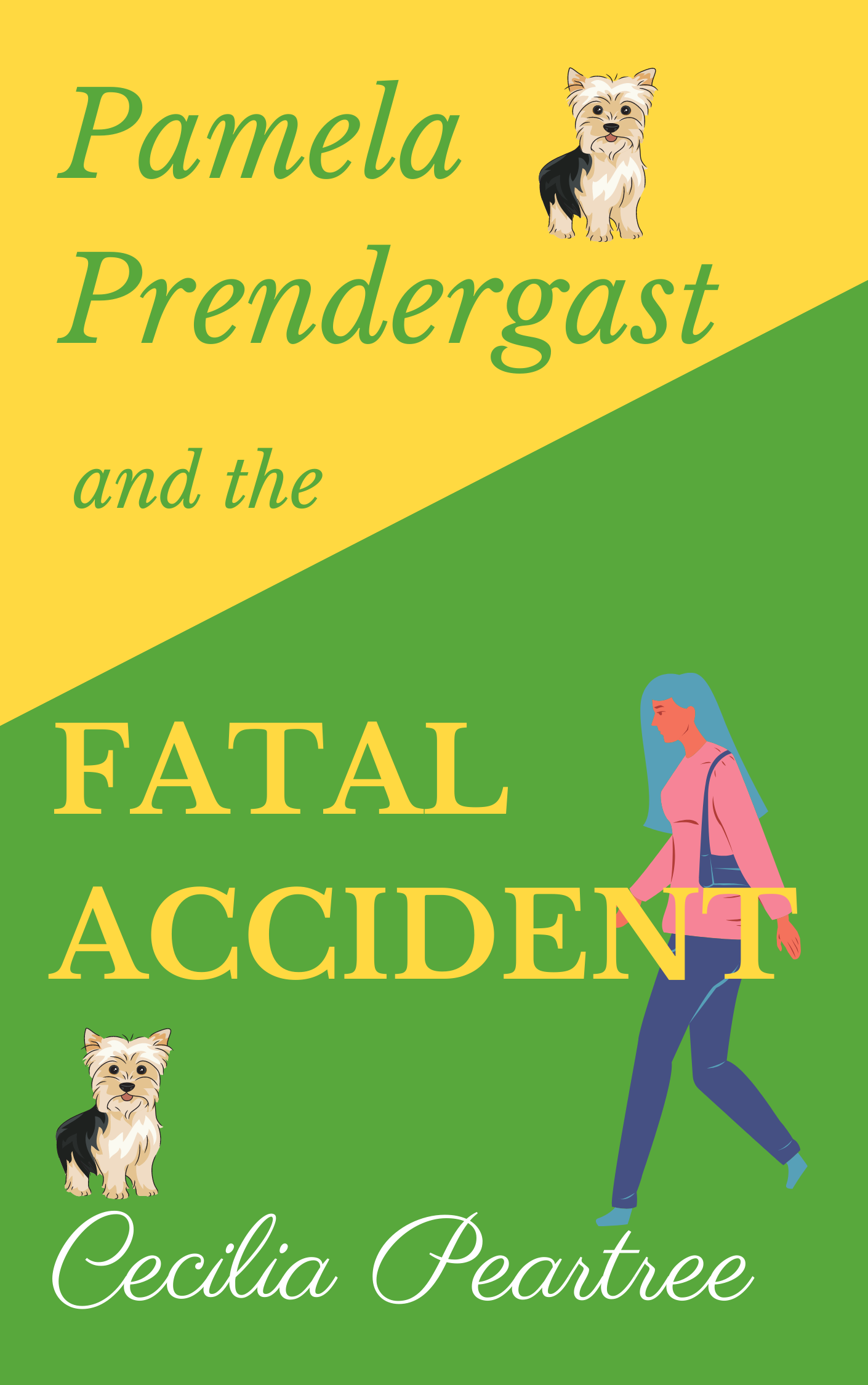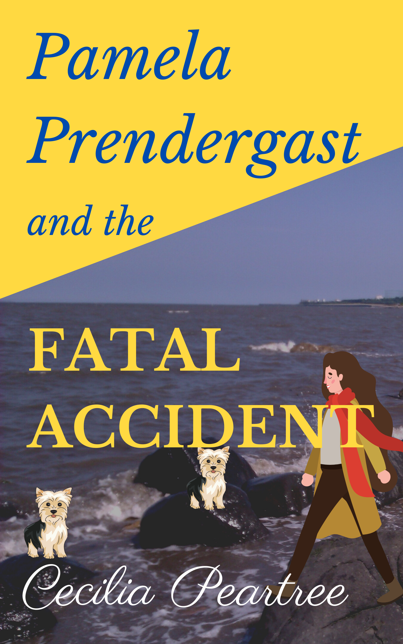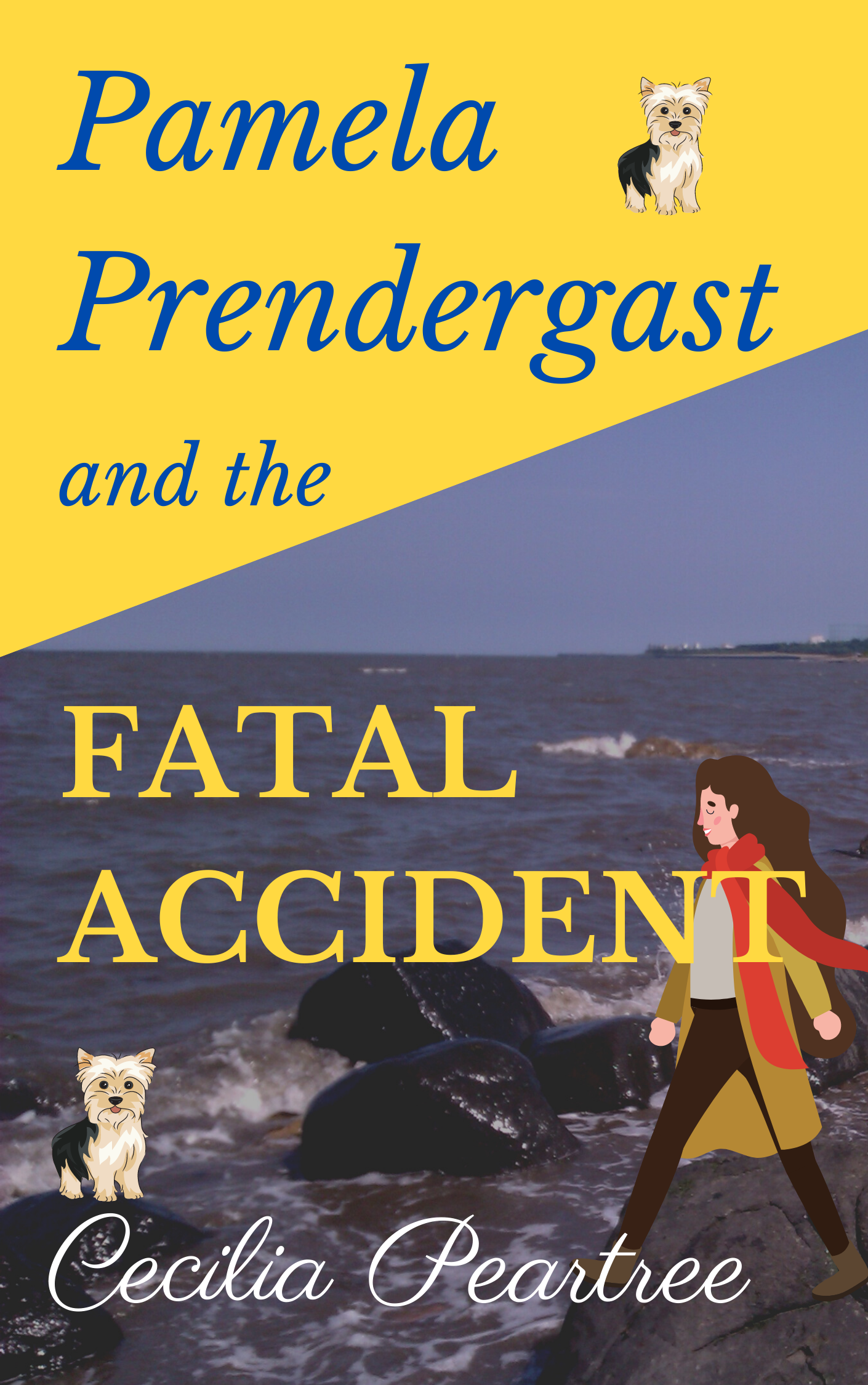 I should just explain that there are two Yorkshire terriers who play quite a large part in the story. I’d quite like them both to be standing on the rocks but I think the version with only one of them on the rocks is slightly better for some reason. I’m including a plainer version of the cover which was my original design before I started thinking it was too plain. The woman’s figure can also easily be changed.